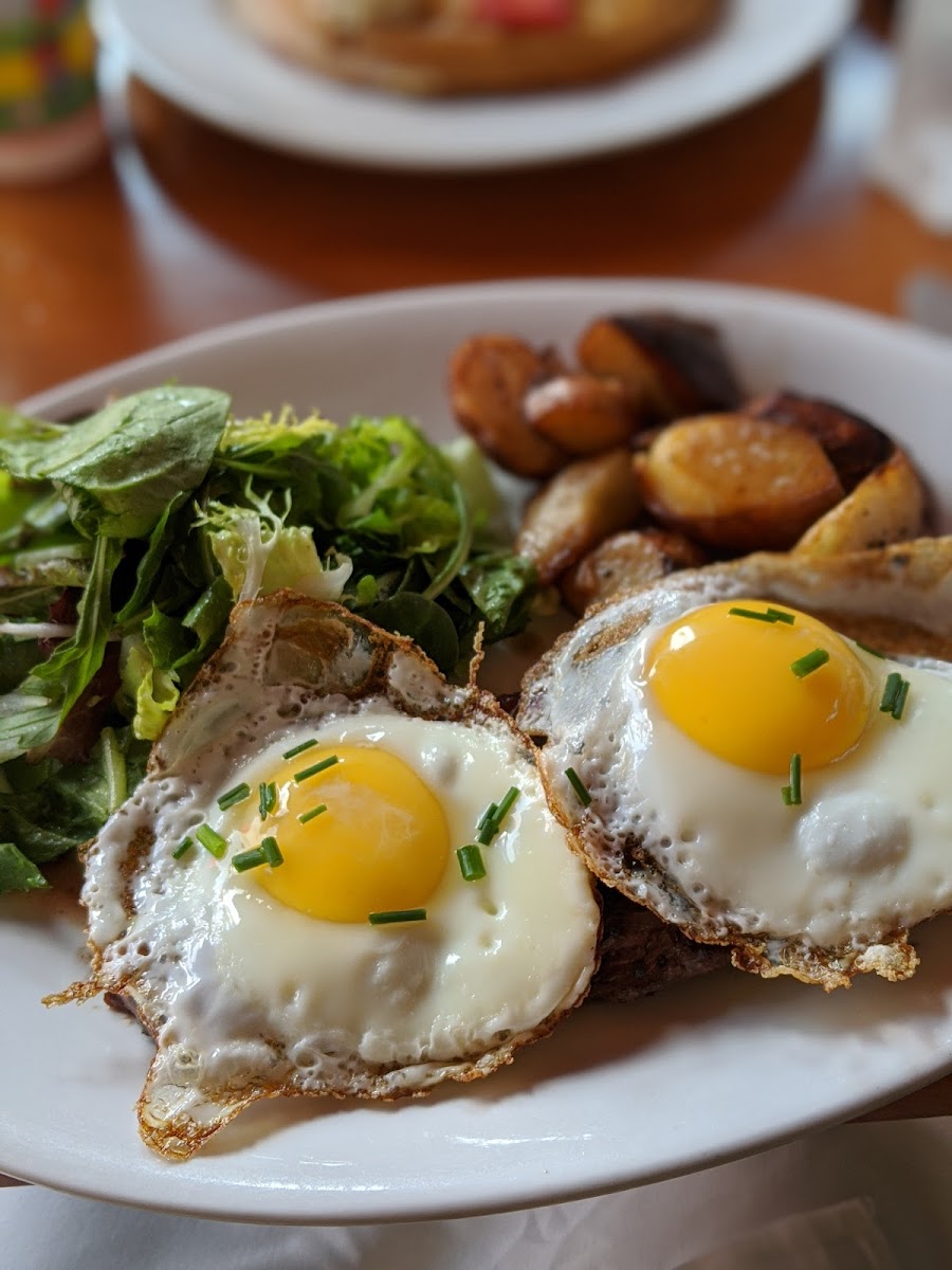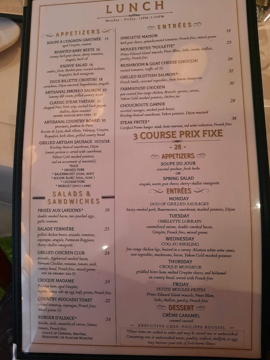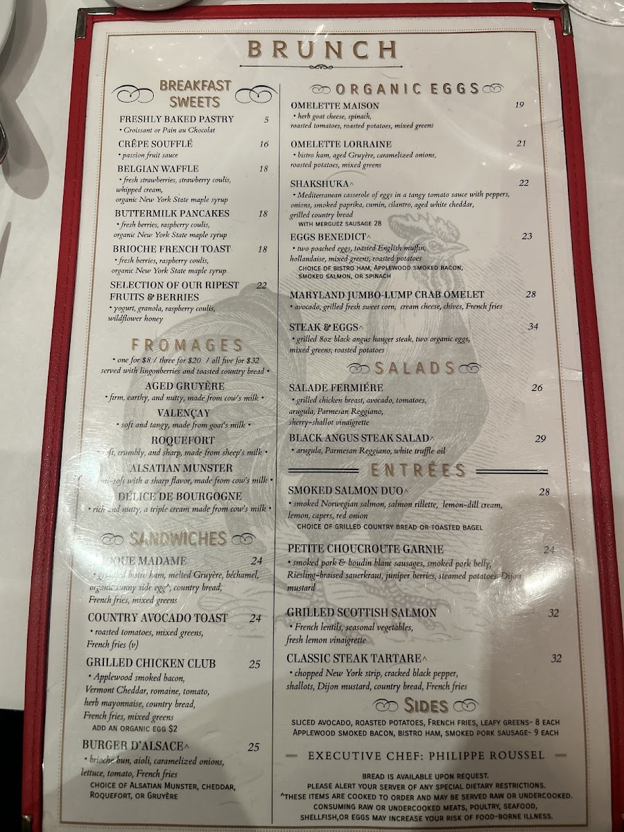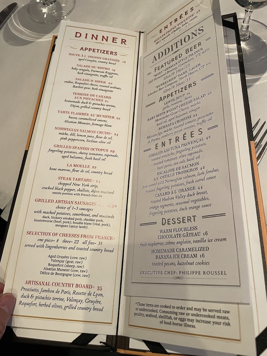 The cheese selection is a highlight not to be missed. Savor the Délice de Bourgogne, a rich and nutty triple cream delight, or the sharp flavors of Roquefort that perfectly complement the house-made accompaniments. Other popular dishes include the Croque Madame, a perfect blend of griddled bistro ham, melted Gruyère, and a sunny-side egg, all paired beautifully with crunchy French fries and a fresh mixed greens salad. Don't overlook the salads, like the Black Angus Steak Salad, which is a hearty yet refreshing choice, topped with white truffle oil for an exquisite finish.